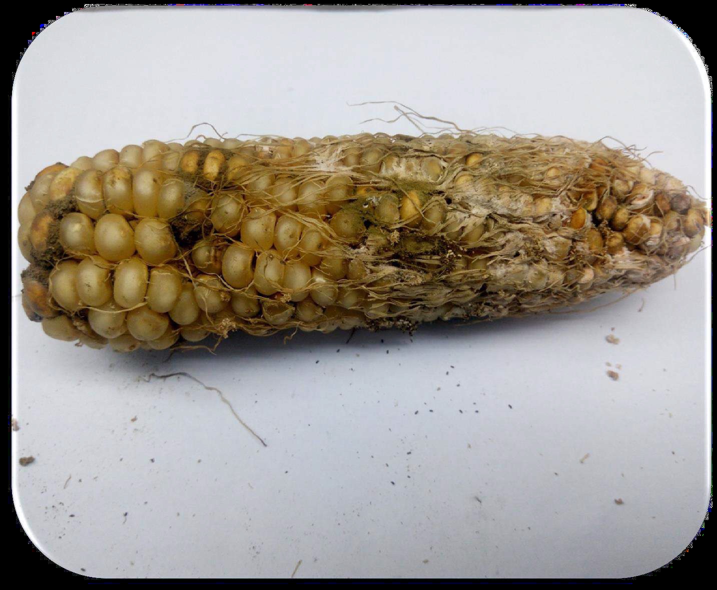 Dalili: 1. Hutoa ukungu wa unga wa kijani kwenye na kati ya punje za mahindi |